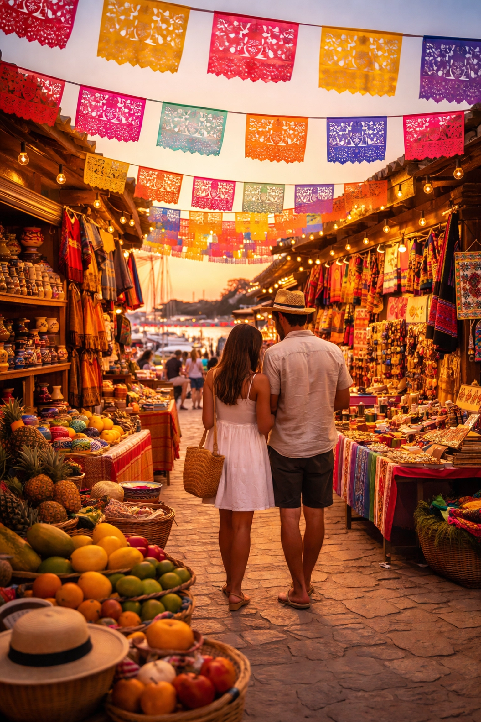 Art & Market Marina Vallarta runs from 6 PM to 10 PM along the waterfront, and it has a completely different vibe than the morning markets. More romantic, if I'm being honest. The sun is setting. The lights come on. It's pretty dreamy.