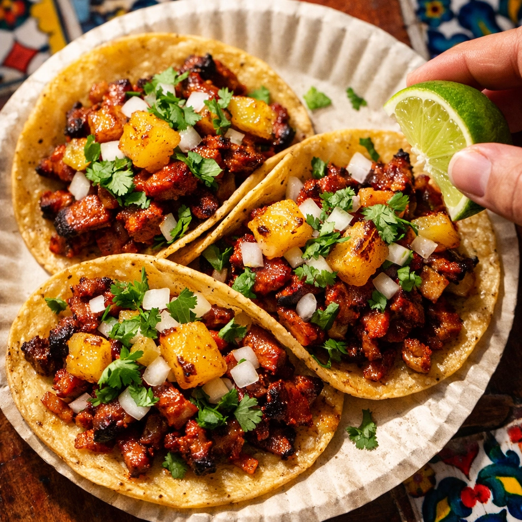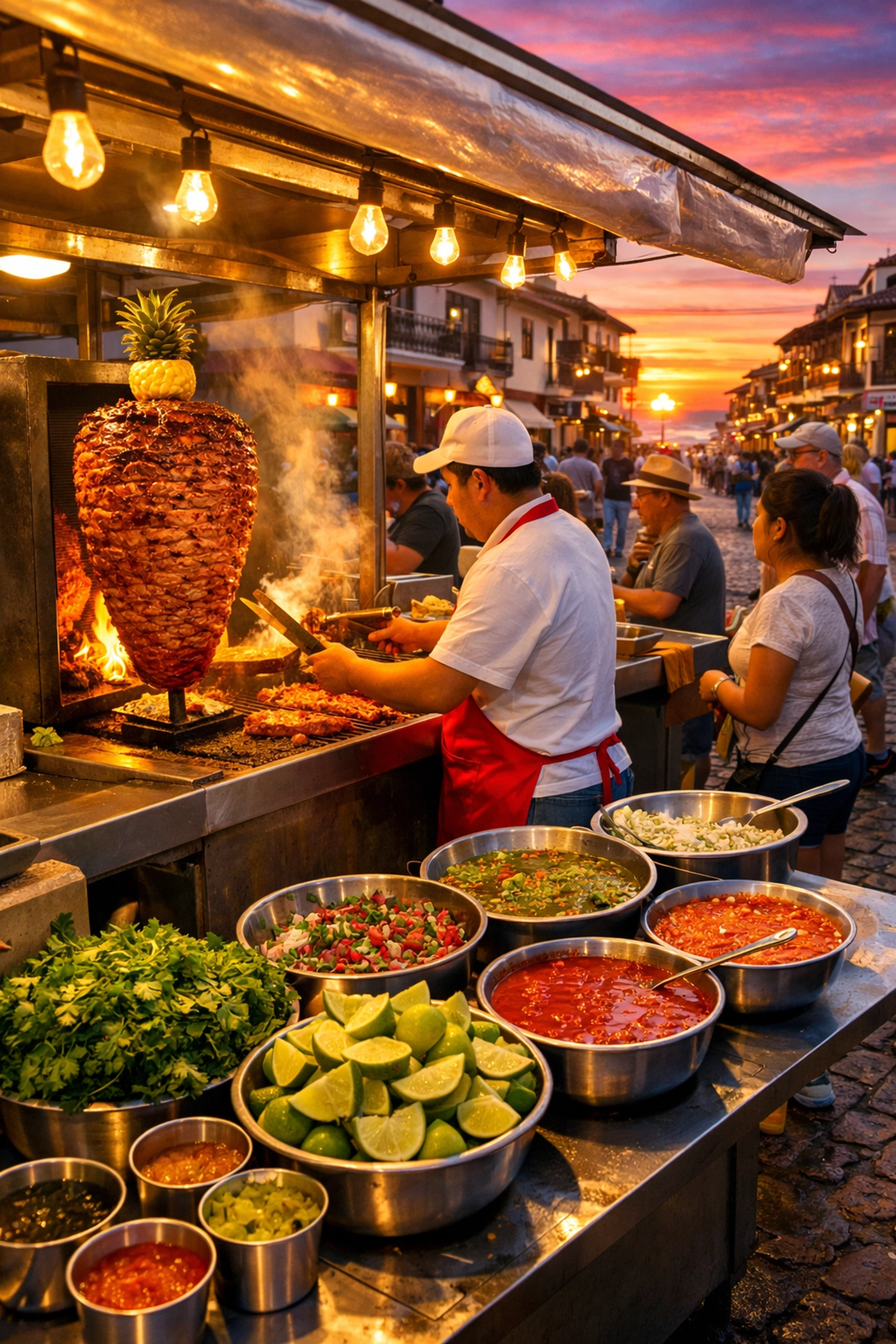 The streets come alive around 5 PM when vendors start setting up their carts. By 6 PM, the smell of grilled meat, fresh cilantro, and lime fills the air.