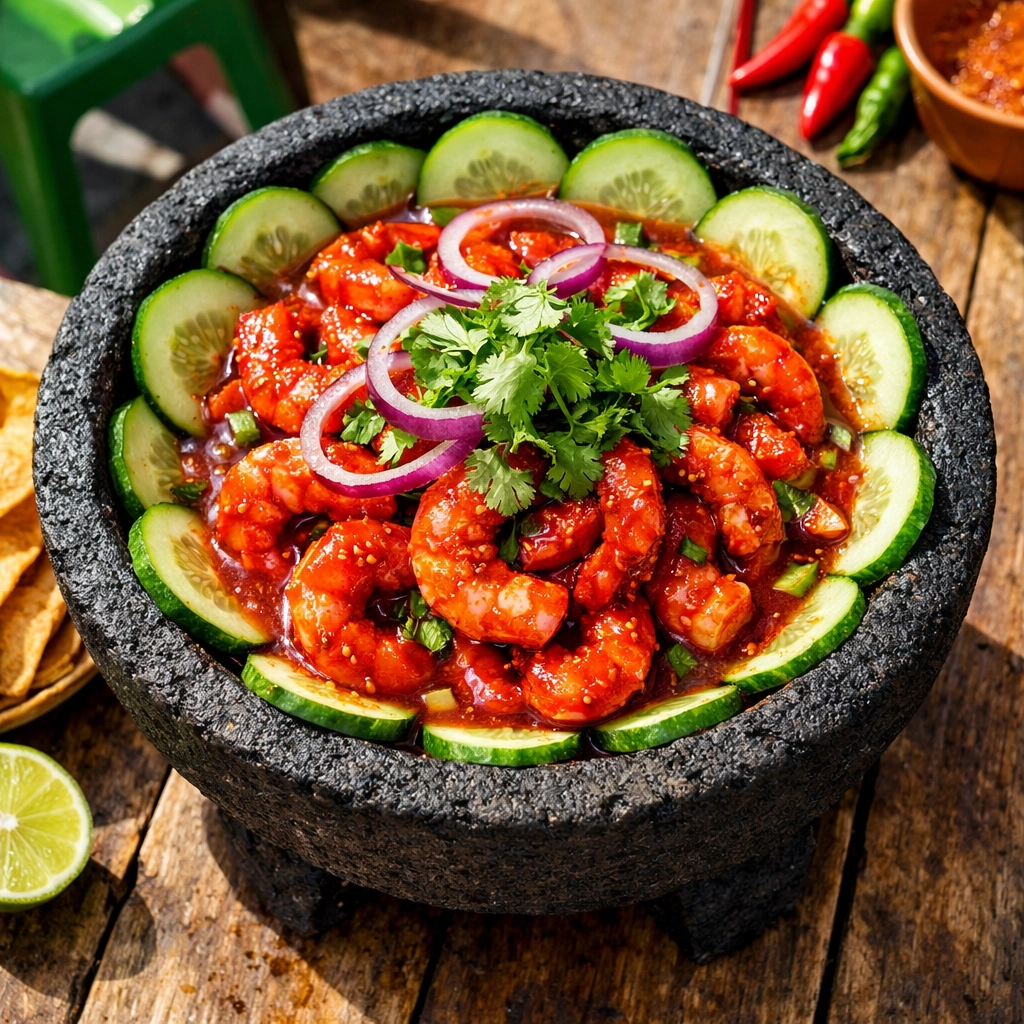 We ordered aguachile that arrived in a molcajete, bright red with chiltepin peppers, lime, and cucumber. The shrimp were so fresh they were still translucent. My partner ordered camarones al coco, and they brought out this massive platter that could've fed four people.
